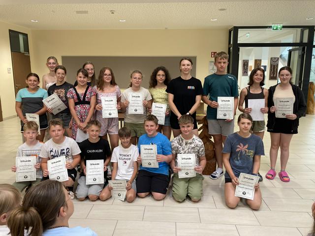 Die 1. Klassen erhielten ihre Schwimmabzeichen der Schwimmwoche und Schüler und Schülerinnen der 3. Klassen ihren Alround-Schwimmer