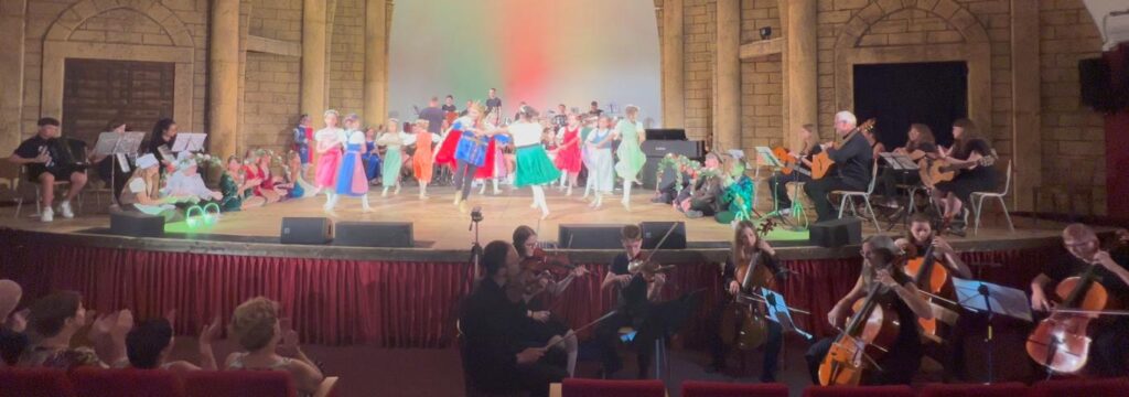 Die Ballettschule (Ltg. Marie-Rose Wagner) und die Musikschule Kirchschlag (Ltg. Dir. Bernhard Putz) präsentierten gemeinsam mit der NÖMS im Rahmen einer öffentlichen Vorstellung am Sonntag, dem 23.6.2024, im Passionsspielhaus ein Kooperationsprojekt der besonderen Art: „Der König tanzt“ – ein Tanzschauspiel nach dem Kinderbuch der bekannten Autorin Jutta Treiber aus Oberpullendorf über Krieg und Frieden bzw. über Gewalt und Lebensfreude.